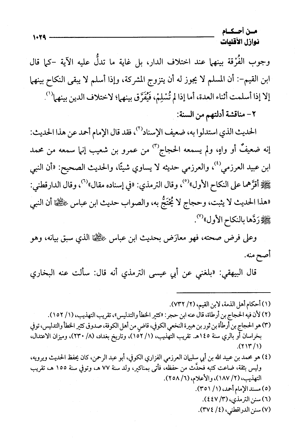 الحديث الذي استدلوا به، ضعيف الإسناد (¬2)، فقد قال الإمام أحمد عن هذا الحديث: إنه ضعيفٌ أو واهٍ، ولم يسمعه الحجاج (¬3) من عمرو بن شعيب إنما سمعه من محمد ابن عبيد العرزمي (¬4)، والعرزمي حديثه لا يساوي شيئًا، والحديث الصحيح: "أن النبي - صلى الله عليه وسلم - أقرَّهما على النكاح الأول" (¬5)، وقال الترمذي: "في إسناده مقال" (¬6)، وقال الدارقطني: "هذا الحديث لا يثبت، وحجاج لا يُحْتَجُّ به، والصواب حديث ابن عباس -رضي الله عنهما- أن النبي - صلى الله عليه وسلم - رَدَّها بالنكاج الأول" (¬7).