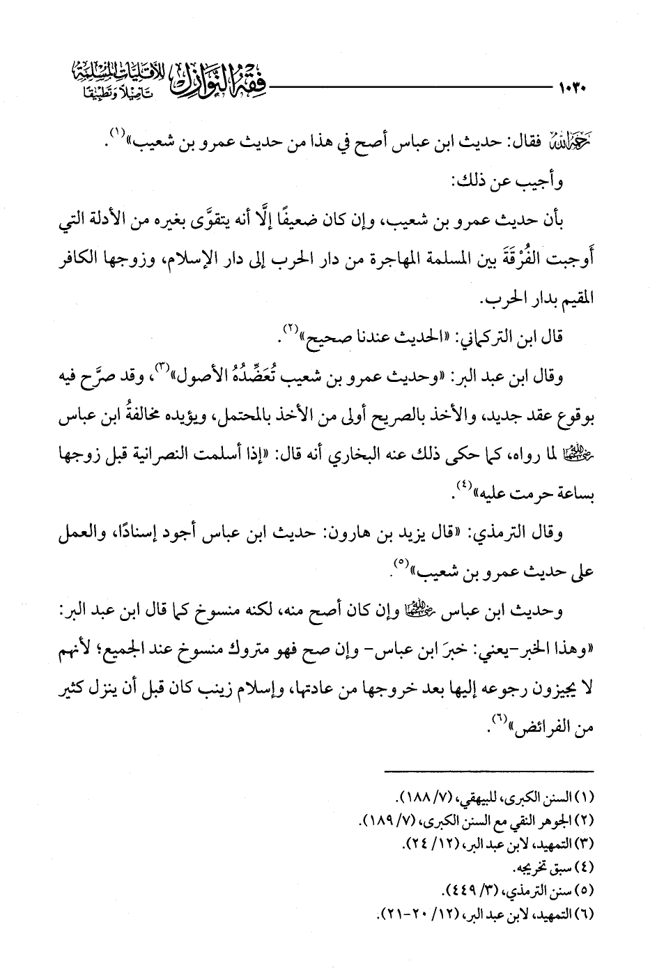 وقال ابن عبد البر: "وحديث عمرو بن شعيب تُعَضِّدُهُ الأصول" (¬3)، وقد صرَّح فيه بوقوع عقد جديد، والأخذ بالصريح أولى من الأخذ بالمحتمل، ويؤيده مخالفةُ ابن عباس -رضي الله عنهما- لما رواه، كما حكى ذلك عنه البخاري أنه قال: "إذا أسلمت النصرانية قبل زوجها بساعة حرمت عليه" (¬4).