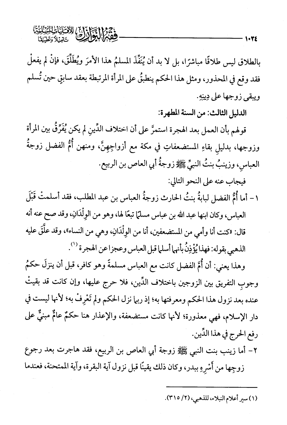 قولهم بأن العمل بعد الهجرة استمرَّ على أن اختلاف الدِّينِ لم يكن يُفَرِّقُ بين المرأة وزوجها، بدليلِ بقاءِ المستضعفاتِ في مكة مع أزواجِهِنَّ، ومنهن أُمُّ الفضل زوجةُ العباسِ، وزينبُ بنتُ النبيِّ - صلى الله عليه وسلم - زوجةُ أبي العاص بن الربيع.
