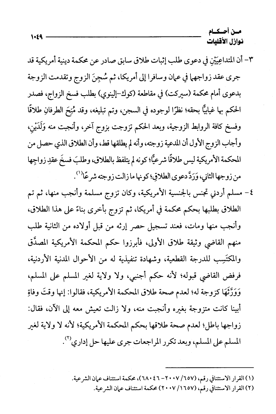 4 - مسلم أردني تجنس بالجنسية الأمريكية، وكان تزوج مسلمة وأنجب منها، ثم تم الطلاق بطلبها بحكم محكمة في أمريكا، ثم تزوج بأخرى بناءً على هذا الطلاق، وأنجب منها ومات، فعند تسجيل حصر إرثه من قبل أولاده من الثانية طلب منهم القاضي وثيقة طلاق الأولى، فأبرزوا حكم المحكمة الأمريكية المصدَّق والمكتَسِب للدرجة القطعية، وشهادة تنفيذية له من الأحوال المدنية الأردنية، فرفض القاضي قبوله؛ لأنه حكم أجنبي، ولا ولاية لغير المسلم على المسلم، وَوَرَّثَهَا كزوجة له؛ لعدم صحة طلاق المحكمة الأمريكية، فقالوا: إنها وقتَ وفاةِ أبينا كانت متزوجة بغيره وأنجبت منه، ولا زالت تعيش معه إلى الآن، فقال: زواجها باطل؛ لعدم صحة طلاقها بحكم المحكمة الأمريكية؛ لأنه لا ولاية لغير المسلم على المسلم، وبعد تكرر المراجعات جرى عليها حل إداري (¬2).