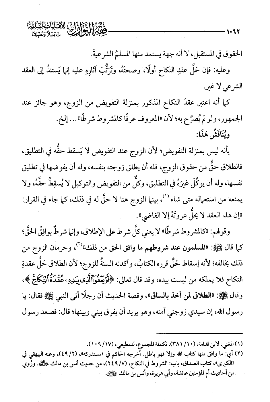 وقولهم: "كالمشروط شرطًا" لا يعني كلَّ شرط على الإطلاق، وإنما شرطٌ يوافِقُ الحقَّ؛ كما قال - صلى الله عليه وسلم -: "المسلمون عند شروطهم ما وافق الحق من ذلك" (¬2)، وحرمان الزوج من ذلك يخالفه؛ لأنه إسقاط لحقٍّ قرره الكتابُ، وأكدته السنةُ للزوج؛ لأن الطلاق حَلُّ عقدةِ النكاح فلا يملكه من ليست بيده، وقد قال تعالى: {أَوْ يَعْفُوَ الَّذِي بِيَدِهِ عُقْدَةُ النِّكَاحِ}، وقال - صلى الله عليه وسلم -: "الطلاق لمن أخذ بالساق"، وقصة الحديث أن رجلًا أتى النبي - صلى الله عليه وسلم - فقال: يا رسول الله، إن سيدي زوجني أمته، وهو يريد أن يفرق بيني وبينها؛ قال: فصعد رسول