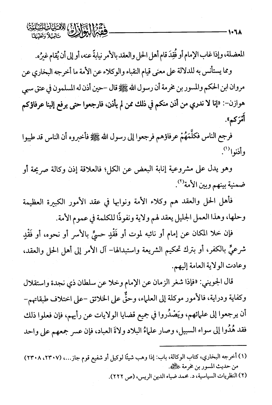 ومما يستأنس به للدلالة على معنى قيام النقباء والوكلاء عن الأمة ما أخرجه البخاري عن مروان ابن الحكم والمسور بن مخرمة أن رسول الله - صلى الله عليه وسلم - قال -حين أذن له المسلمون في عتق سبي هوازن-: "إنا لا ندري من أذن منكم في ذلك ممن لم يأذن، فارجعوا حتى يرفع إلينا عرفاؤكم أَمْرَكم".