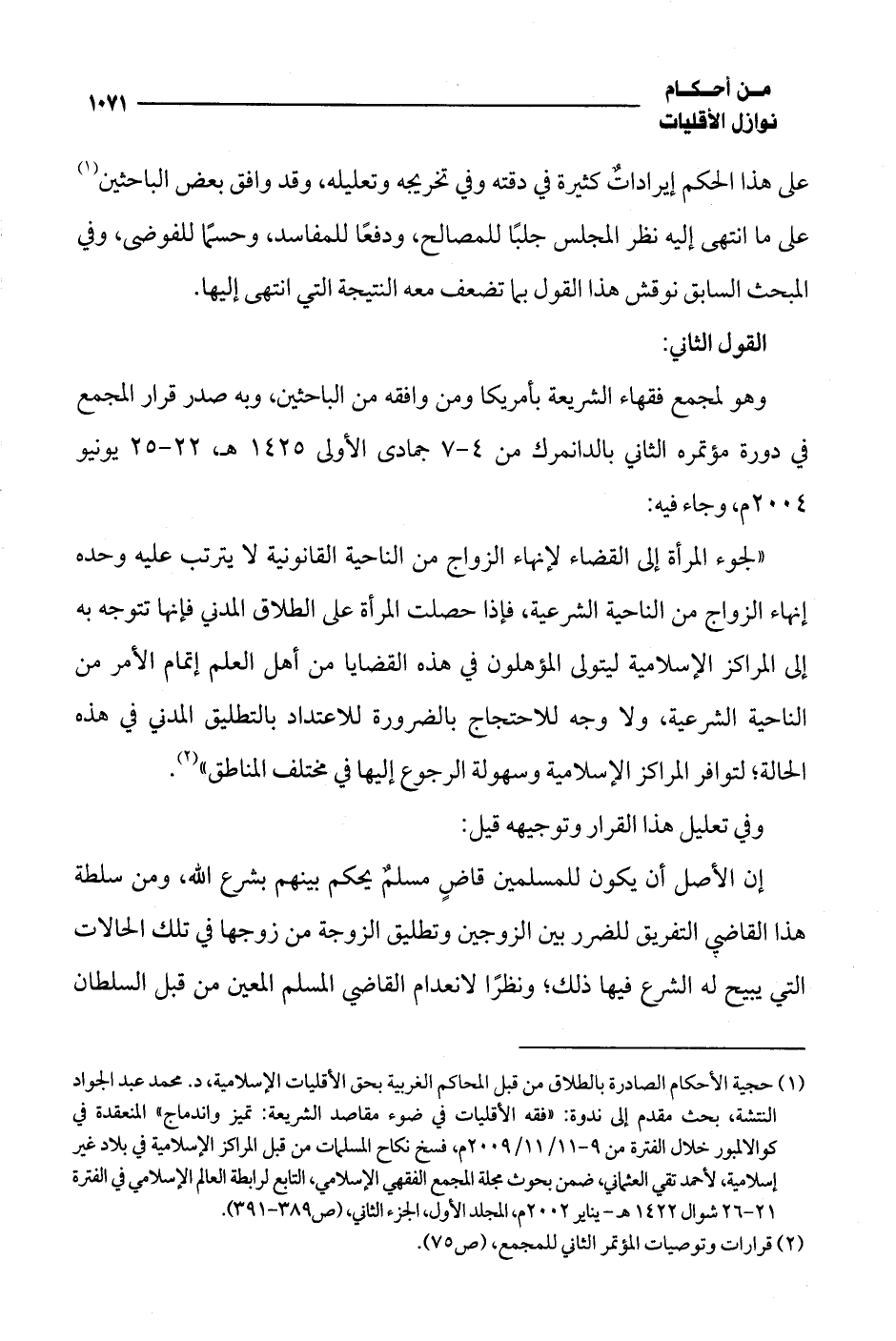 (¬1) حجية الأحكام الصادرة بالطلاق من قبل المحاكم الغربية بحق الأقليات الإسلامية، د. محمد عبد الجواد النتشة، بحث مقدم إلى ندوة: "فقه الأقليات في ضوء مقاصد الشريعة: تميز واندماج" المنعقدة في كوالالمبور خلال الفترة من 9 - 11/ 11/ 2009 م، فسخ نكاح المسلمات من قبل المراكز الإسلامية في بلاد غير إسلامية، لأحمد تقي العثماني، ضمن بحوث مجلة المجمع الفقهي الإسلامي، التابع لرابطة العالم الإسلامي في الفترة 21 - 26 شوال 1422 هـ - يناير 2002 م، المجلد الأول، الجزء الثاني، (ص 389 - 391).