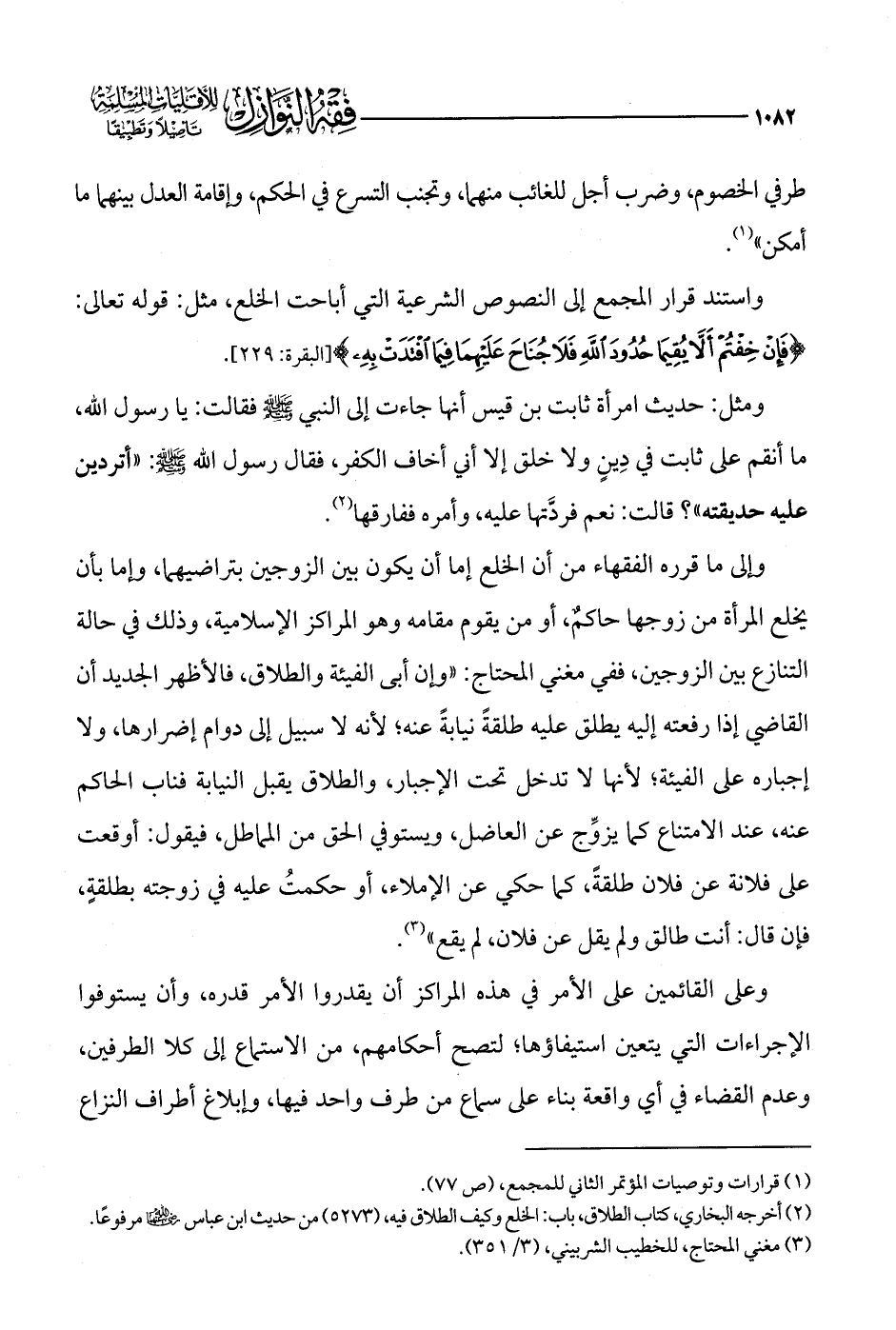واستند قرار المجمع إلى النصوص الشرعية التي أباحت الخلع، مثل: قوله تعالى: {فَإِنْ خِفْتُمْ أَلَّا يُقِيمَا حُدُودَ اللَّهِ فَلَا جُنَاحَ عَلَيْهِمَا فِيمَا افْتَدَتْ بِهِ} [البقرة: 229].