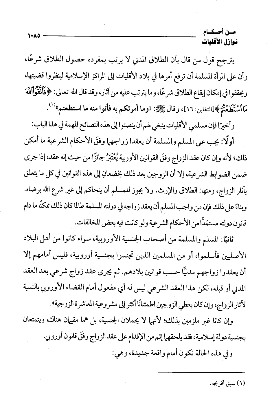 وإن كانا غير ملزمين بذلك؛ لأنهما لا يحملان الجنسية، بل هما مقيمان هناك، ويتمتعان بجنسية دولة إسلامية، فقد يلحقهما إثم من الإقدام على عقد الزواج وفقَ قانون أوروبي.