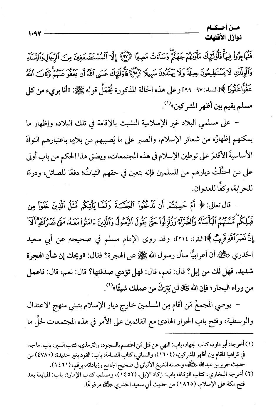 فَتُهَاجِرُوا فِيهَا فَأُولَئِكَ مَأْوَاهُمْ جَهَنَّمُ وَسَاءَتْ مَصِيرًا (97) إِلَّا الْمُسْتَضْعَفِينَ مِنَ الرِّجَالِ وَالنِّسَاءِ وَالْوِلْدَانِ لَا يَسْتَطِيعُونَ حِيلَةً وَلَا يَهْتَدُونَ سَبِيلًا (98) فَأُولَئِكَ عَسَى اللَّهُ أَنْ يَعْفُوَ عَنْهُمْ وَكَانَ اللَّهُ عَفُوًّا غَفُورًا} [النساء: 97 - 99] وعلى هذه الحالة المذكورة يُحْمَلُ قوله - صلى الله عليه وسلم -: "أنا بريء من كل مسلم يقيم بين أظهر المشركين" (¬1).