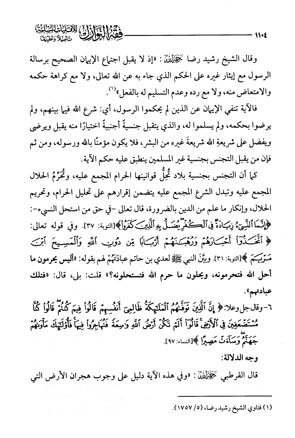 كما أن التجنس بجنسية بلاد تُحِلُّ قوانينها الحرام المجمع عليه، وتُحَرِّمُ الحلال المجمع عليه وتبدل الشرع المجمع عليه يتضمن إقرارهم على تحليل الحرام، وتحريم الحلال، وإنكار ما علم من الدين بالضرورة، قال تعالى -في حق من استحل النسيء-: {إِنَّمَا النَّسِيءُ زِيَادَةٌ فِي الْكُفْرِ يُضَلُّ بِهِ الَّذِينَ كَفَرُوا} [التوبة: 37]. وفي قوله تعالى: {اتَّخَذُوا أَحْبَارَهُمْ وَرُهْبَانَهُمْ أَرْبَابًا مِنْ دُونِ اللَّهِ وَالْمَسِيحَ ابْنَ مَرْيَمَ} [التوبة: 31]. وبيَّنَ النبي - صلى الله عليه وسلم - لعدي بن حاتم عبادَتَهُمْ لهم بقوله: "أليس يحرمون ما أحل الله فتحرمونه، ويحلون ما حرم الله فتستحلونه؟ " قلت: بلى، قال: "فتلك عبادتهم".