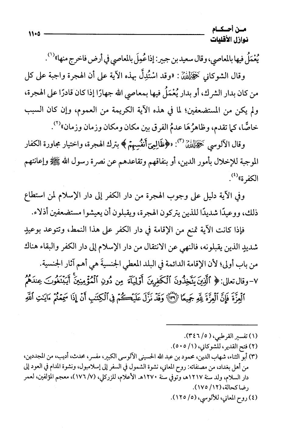 وقال الشوكاني -رحمه الله-: "وقد اسْتُدِلَّ بهذه الآية على أن الهجرة واجبة على كل من كان بدار الشرك، أو بدار يُعْمَلُ فيها بمعاصي الله جهارًا إذا كان قادرًا على الهجرة، ولم يكن من المستضعفين؛ لما في هذه الآية الكريمة من العموم، وإن كان السبب خاصًّا، كما تقدم، وظاهرُهَا عدمُ الفرق بين مكان ومكان وزمان وزمان" (¬2).