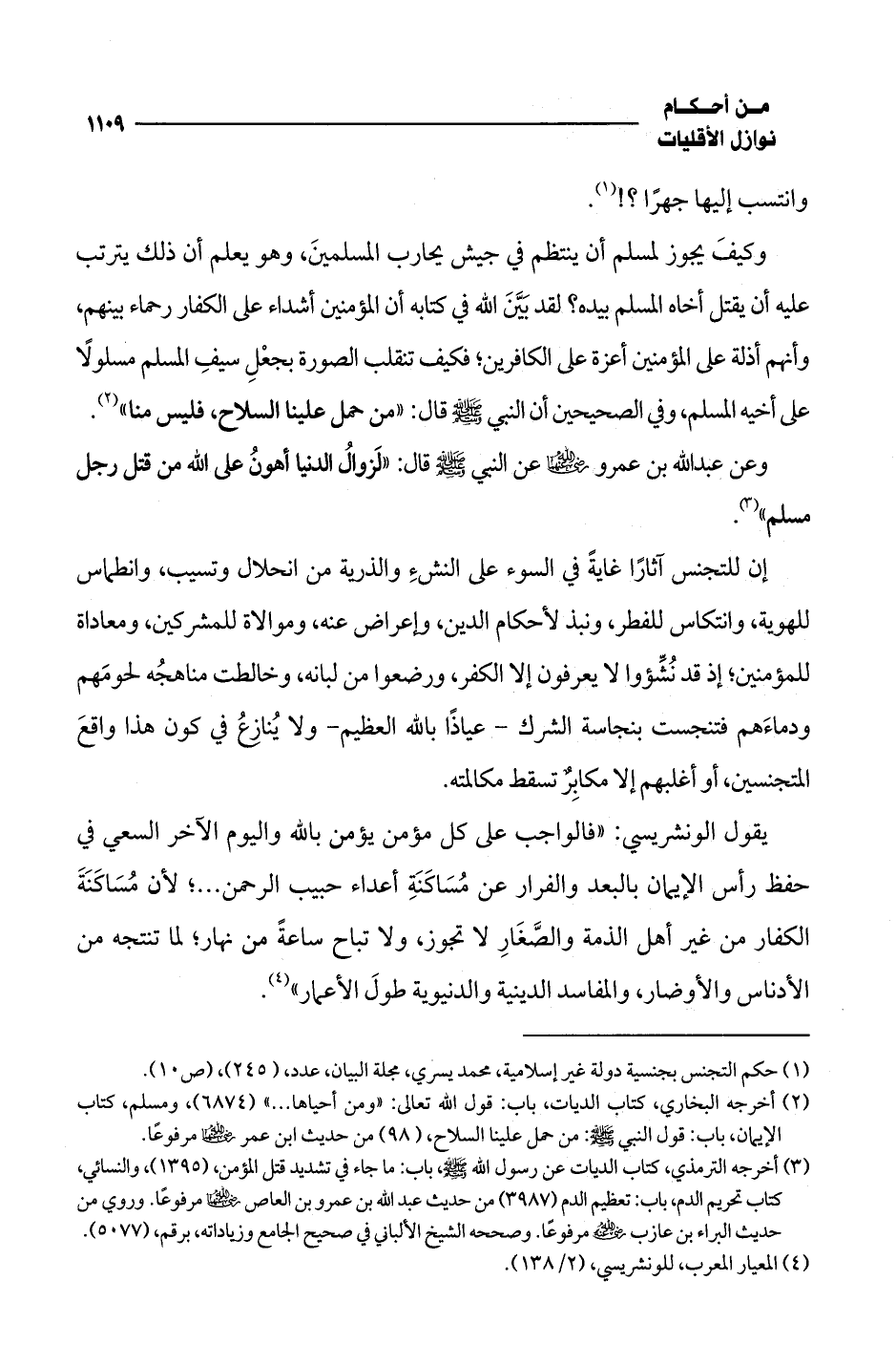 وكيفَ يجوز لمسلم أن ينتظم في جيش يحارب المسلمينَ، وهو يعلم أن ذلك يترتب عليه أن يقتل أخاه المسلم بيده؟ لقد بَيَّنَ الله في كتابه أن المؤمنين أشداء على الكفار رحماء بينهم، وأنهم أذلة على المؤمنين أعزة على الكافرين؛ فكيف تنقلب الصورة بجعْلِ سيفِ المسلم مسلولًا على أخيه المسلم، وفي الصحيحين أن النبي - صلى الله عليه وسلم - قال: "من حمل علينا السلاح، فليس منا" (¬2).