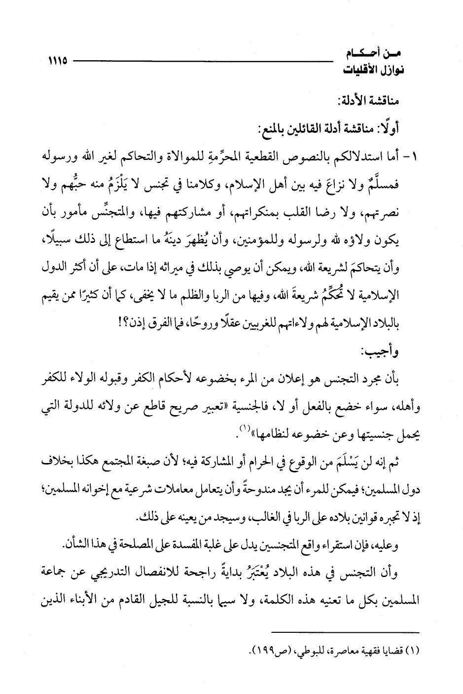 1 - أما استدلالكم بالنصوص القطعية المحرِّمةِ للموالاة والتحاكم لغير الله ورسوله فمسلَّمٌ ولا نزاعَ فيه بين أهل الإسلام، وكلامنا في تجنس لا يَلْزَمُ منه حبُّهم ولا نصرتهم، ولا رضا القلب بمنكراتهم، أو مشاركتهم فيها، والمتجنِّس مأمور بأن يكون ولاؤه لله ولرسوله وللمؤمنين، وأن يُظهرَ دينَهُ ما استطاع إلى ذلك سبيلًا، وأن يتحاكمَ لشريعة الله، ويمكن أن يوصي بذلك في ميراثه إذا مات، على أن أكثر الدول الإسلامية لا تُحَكِّمُ شريعةَ الله، وفيها من الربا والظلم ما لا يخفى، كما أن كثيرًا ممن يقيم بالبلاد الإسلامية لهم ولاءاتهم للغربيين عقلًا وروحًا، فما الفرق إذن؟!