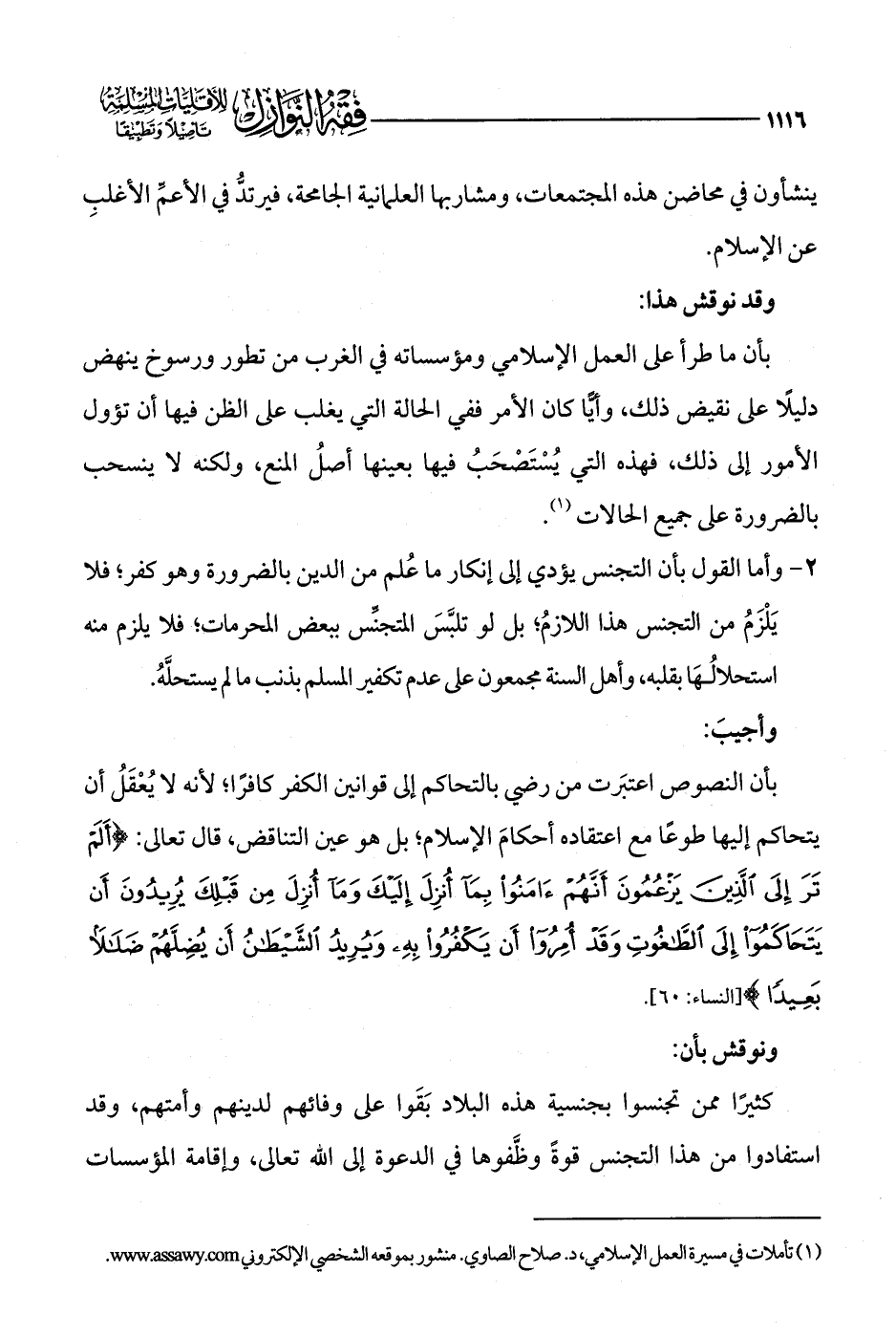 بأن ما طرأ على العمل الإسلامي ومؤسساته في الغرب من تطور ورسوخ ينهض دليلًا على نقيض ذلك، وإيًّا كان الأمر ففي الحالة التي يغلب على الظن فيها أن تؤول الأمور إلى ذلك، فهذه التي يُسْتَصْحَبُ فيها بعينها أصلُ المنع، ولكنه لا ينسحب بالضرورة على جميع الحالات (¬1).