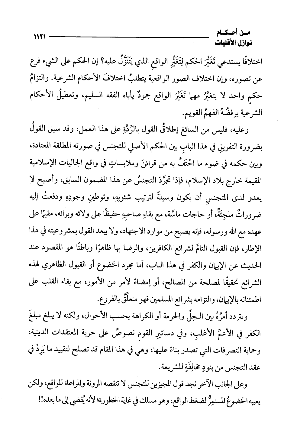 اختلافًا يستدعي تَغَيُّرَ الحكم لِتَغَيُّر الواقعِ الذي يَتَنَزَّلُ عليه؟ إن الحكم على الشيء فرع عن تصوره، وإن اختلاف الصور الواقعية يتطلبُ اختلافَ الأحكام الشرعية. والتزامُ حكمٍ واحد لا يتغيَّرُ مهما تَغَيَّرَ الواقع جمودٌ يأباه الفقه السليم، وتعطيلُ الأحكام الشرعية يرفضُهُ الفهمُ القويم.
