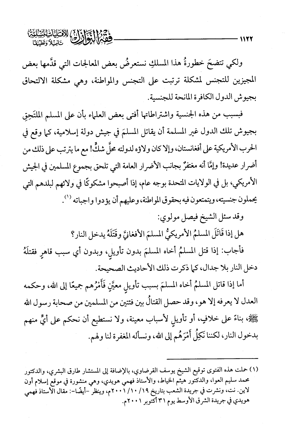 (¬1) حملت هذه الفتوى توقيع الشيخ يوسف القرضاوي، بالإضافة إلى المستشار طارق البشري، والدكتور محمد سليم العوا، والدكتور هيثم الخياط، والأستاذ فهمي هويدي، وهي منشورة في موقع إسلام أون لاين. نت، ونشرت في جريدة الشعب بتاريخ 19/ 10/ 2001 م، وينظر -أيضًا-: مقال الأستاذ فهمي هويدي في جريدة الشروق الأوسط يوم 31 أكتوبر 2001 م.