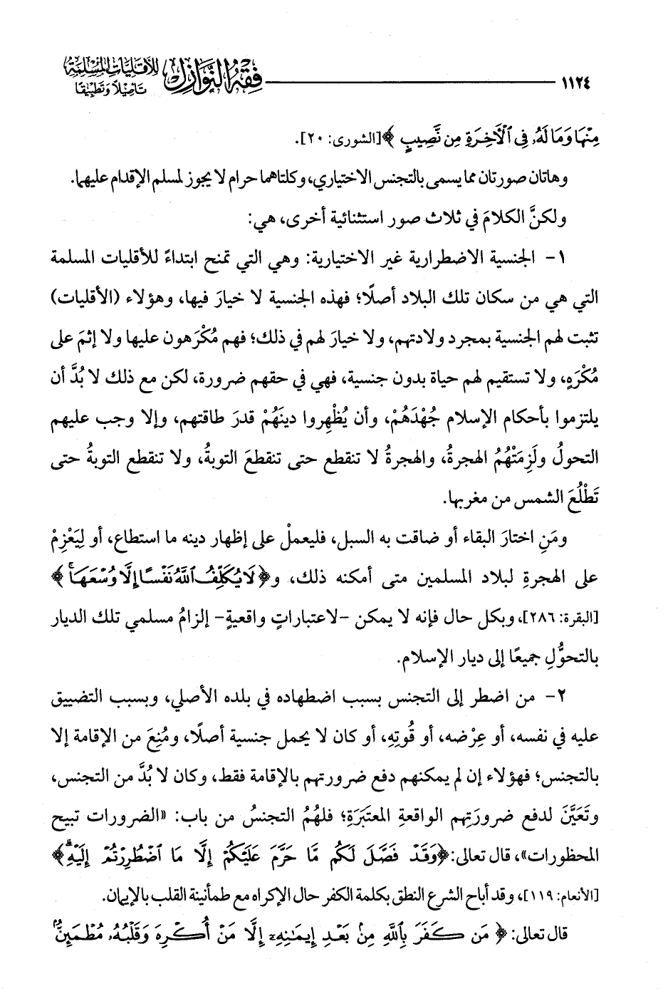 1 - الجنسية الاضطرارية غير الاختيارية: وهي التي تمنح ابتداءً للأقليات المسلمة التي هي من سكان تلك البلاد أصلًا؛ فهذه الجنسية لا خيارَ فيها، وهؤلاء (الأقليات) تثبت لهم الجنسية بمجرد ولادتهم، ولا خيارَ لهم في ذلك؛ فهم مُكْرَهون عليها ولا إثمَ على مُكْرَهٍ، ولا تستقيم لهم حياة بدون جنسية، فهي في حقهم ضرورة، لكن مع ذلك لا بُدَّ أن يلتزموا بأحكام الإسلام جُهْدَهُمْ، وأن يُظْهِروا دينَهُمْ قدرَ طاقتهم، وإلا وجب عليهم التحولُ ولَزِمَتْهُمُ الهجرةُ، والهجرةُ لا تنقطع حتى تنقطعَ التوبةُ، ولا تنقطع التوبةُ حتى تَطْلُعَ الشمس من مغربها.