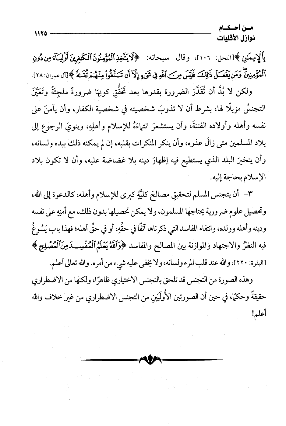 ولكن لا بُدَّ أن تُقَدَّرَ الضرورة بقدرها بعد تَحَقُّقِ كونِهَا ضرورةً ملجِئَةً وتَعَيَّنَ التجنسُ مزيلًا لها، بشرط أن لا تذوبَ شخصيته في شخصية الكفار، وأن يأمنَ على نفسه وأهله وأولاده الفتنةَ، وأن يستشعرَ انتماءَهُ للإسلام وأهلِهِ، وينويَ الرجوع إلى بلاد المسلمين متى زالَ عذره، وأن ينكر المنكرات بقلبه، إن لم يمكنه ذلك بيده ولسانه، وأن يتخيرَ البلد الذي يستطيع فيه إظهارَ دينه بلا غضاضة عليه، وأن لا تكون بلاد الإسلام بحاجة إليه.