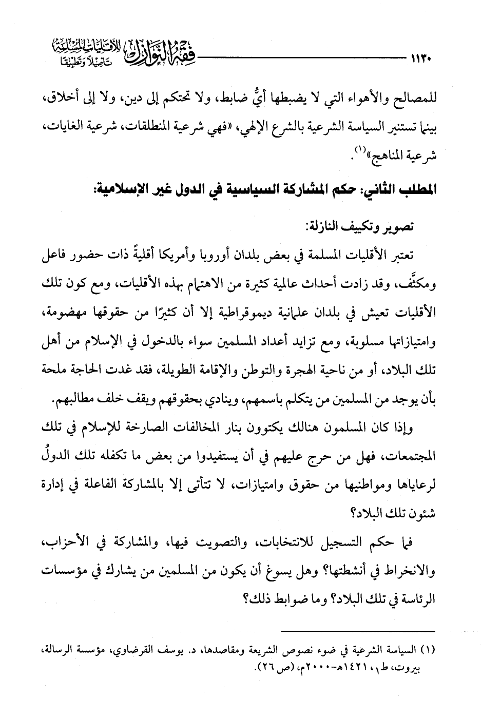 (¬1) السياسة الشرعية في ضوء نصوص الشريعة ومقاصدها، د. يوسف القرضاوي، مؤسسة الرسالة، بيروت، ط 1، 1421 هـ - 2000 م، (ص 26).