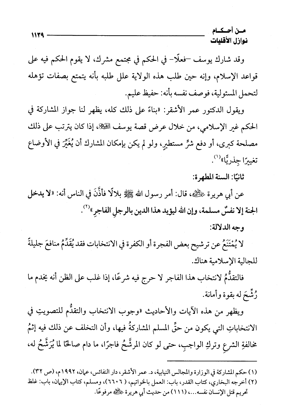 (¬1) حكم المشاركة في الوزارة والمجالس النيابية، د. عمر الأشقر، دار النفائس، عمان، 1992 م، (ص 32).