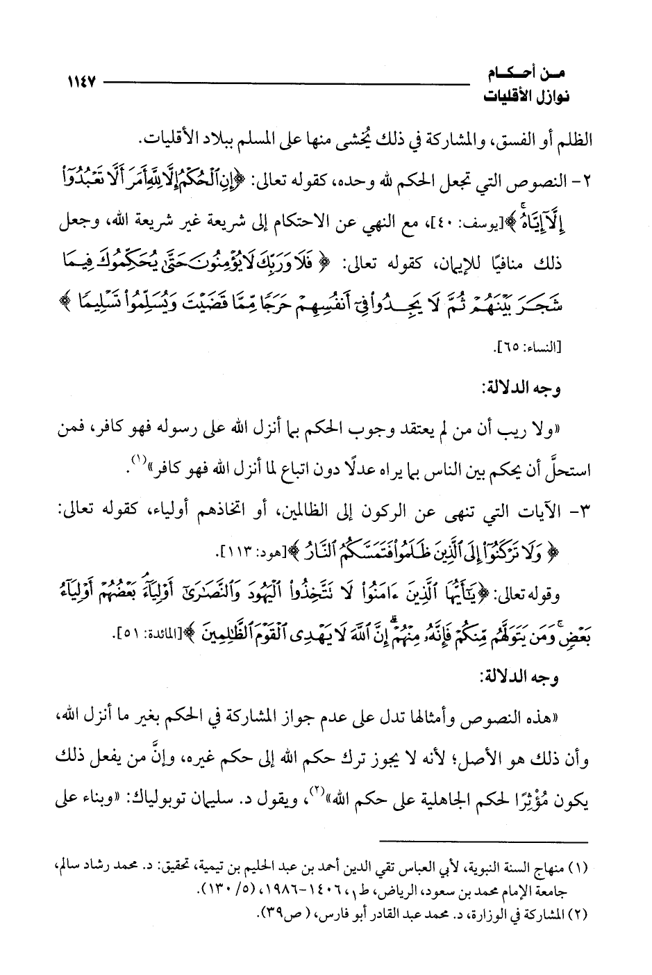 "هذه النصوص وأمثالها تدل على عدم جواز المشاركة في الحكم بغير ما أنزل الله، وأن ذلك هو الأصل؛ لأنه لا يجوز ترك حكم الله إلى حكم غيره، وإنَّ من يفعل ذلك يكون مُؤْثِرًا لحكم الجاهلية على حكم الله" (¬2)، ويقول د. سليمان توبولياك: "وبناء على
