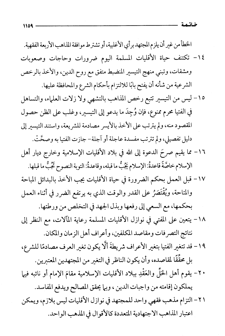 14 - تكتنف حياة الأقليات المسلمة اليوم ضرورات وحاجات وصعوبات ومشقات، وتبني منهج التيسير المنضبط متفق مع روح الدين، والأخذ بالرخص الشرعية من شأنه أن يفتح بابًا للالتزام بأحكام الشرع والمحافظة عليها.