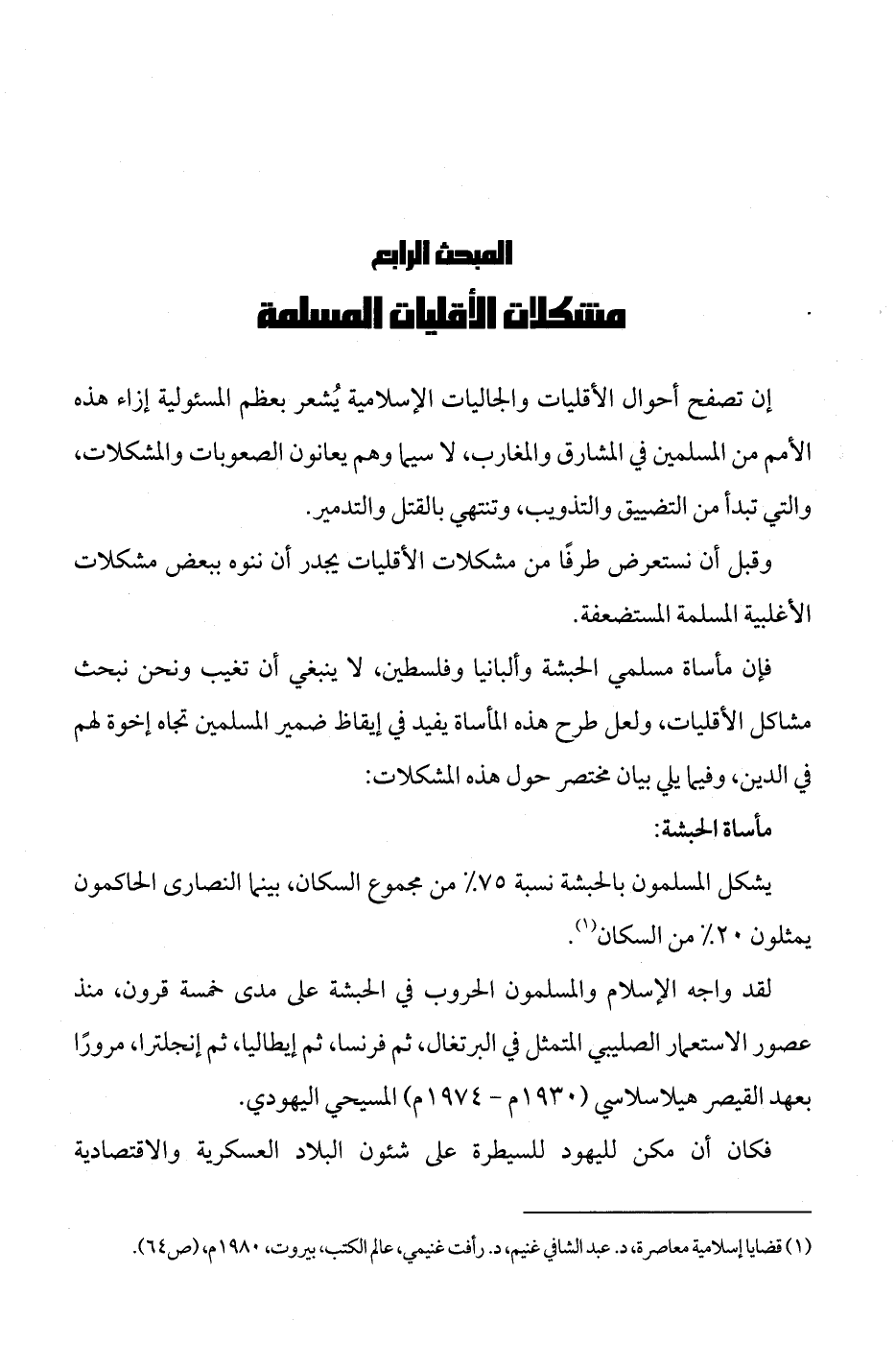فإن مأساة مسلمي الحبشة وألبانيا وفلسطين، لا ينبغي أن تغيب ونحن نبحث مشاكل الأقليات، ولعل طرح هذه المأساة يفيد في إيقاظ ضمير المسلمين تجاه إخوة لهم في الدين، وفيما يلي بيان مختصر حول هذه المشكلات: