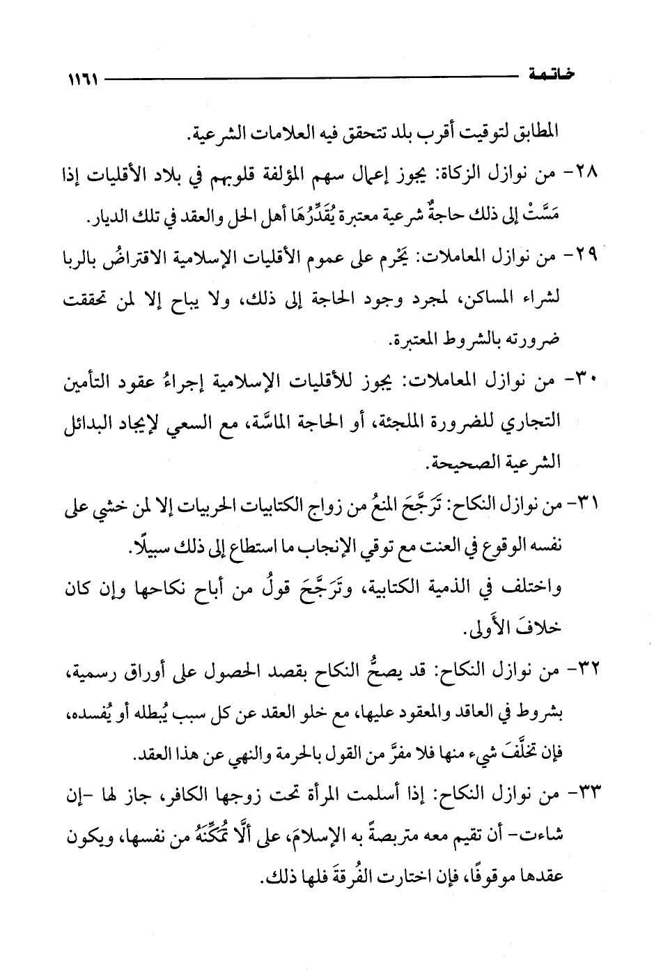 28 - من نوازل الزكاة: يجوز إعمال سهم المؤلفة قلوبهم في بلاد الأقليات إذا مَسَّتْ إلى ذلك حاجةٌ شرعية معتبرة يُقَدِّرُهَا أهل الحل والعقد في تلك الديار.