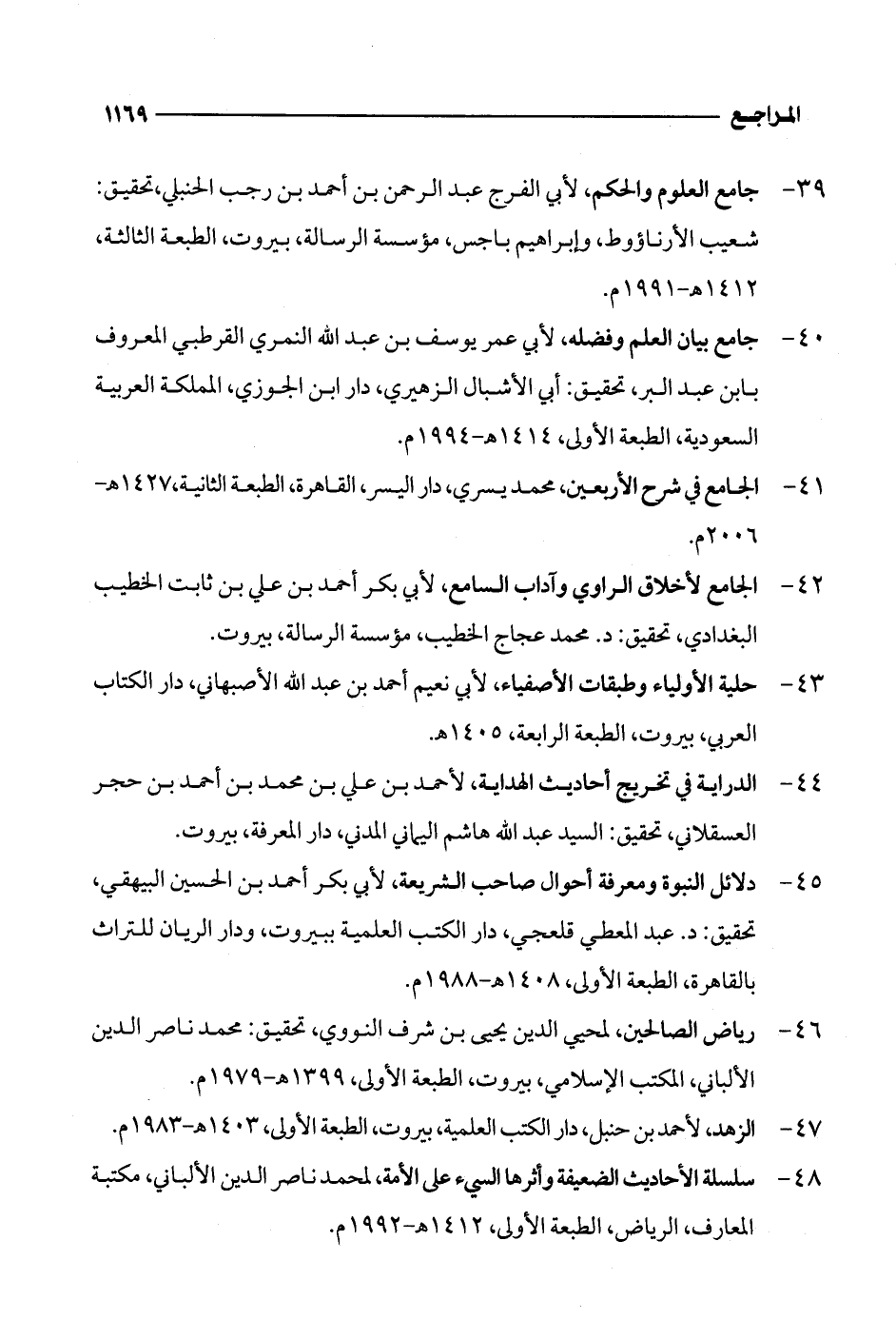 39 - جامع العلوم والحكم، لأبي الفرج عبد الرحمن بن أحمد بن رجب الحنبلي، تحقيق: شعيب الأرناؤوط، وإبراهيم باجس، مؤسسة الرسالة، بيروت، الطبعة الثالثة، 1412 هـ - 1991 م.