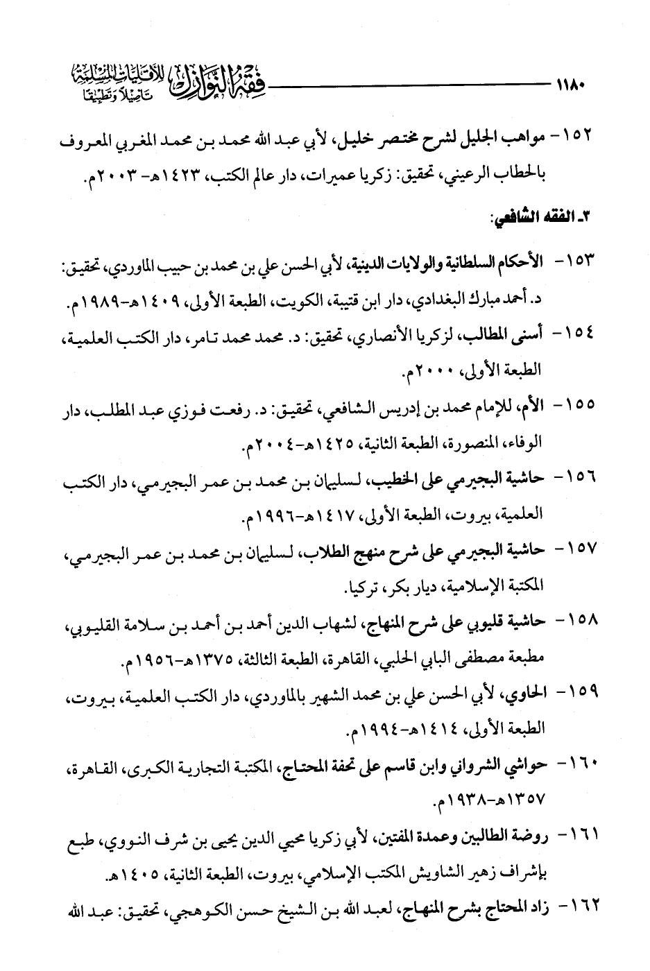 161 - روضة الطالبين وعمدة المفتين، لأبي زكريا محيي الدين يحيى بن شرف النووي، طبع بإشراف زهير الشاويش المكتب الإسلامي، بيروت، الطبعة الثانية، 1405 هـ.