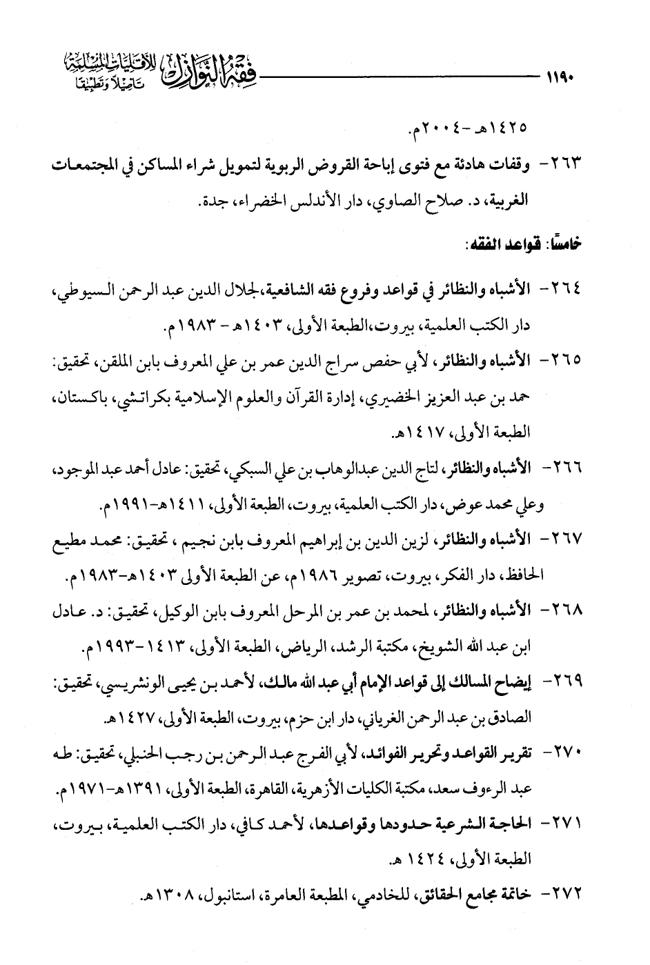 264 - الأشباه والنظائر في قواعد وفروع فقه الشافعية، لجلال الدين عبد الرحمن السيوطي، دار الكتب العلمية، بيروت، الطبعة الأولى، 1403 هـ - 1983 م.