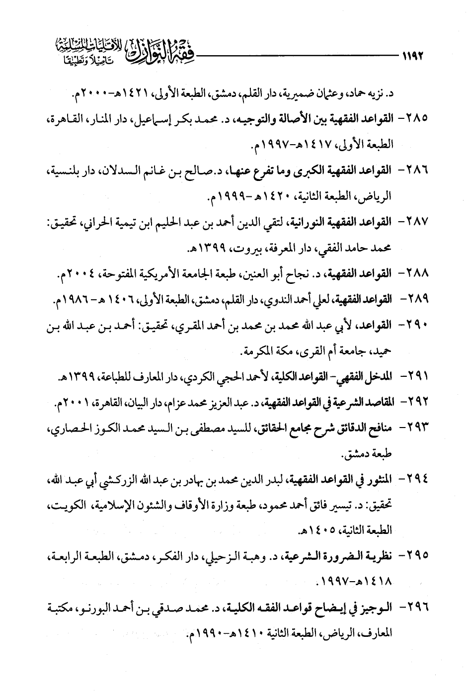 285 - القواعد الفقهية بين الأصالة والتوجيه، د. محمد بكر إسماعيل، دار المنار، القاهرة، الطبعة الأولى، 1417 هـ - 1997 م.