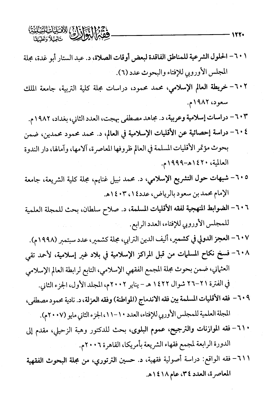 610 - فقه الموازنات والترجيح، عموم البلوى، بحث للدكتور وهبة الزحيلي، مقدم إلى الدورة الرابعة لمجمع فقهاء الشريعة بأمريكا، القاهرة 2006 م.