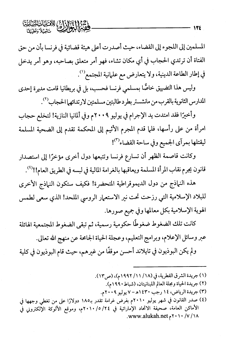 وكانت قاصمة الظهر أن تسارع فرنسا وتتبعها دول أخرى مؤخرًا إلى استصدار قانون يجرم نقاب المرأة المسلمة ويعاقبها بالغرامة المالية في لبسه في الطريق العام!! (¬4).