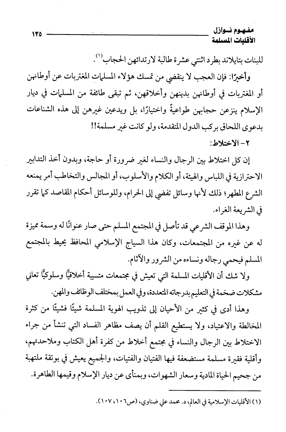 وأخيرًا: فإن العجب لا ينقضي من تمسك هؤلاء المسلمات المغتربات عن أوطانهن أو المغتربات في أوطانهن بدينهن وأخلاقهن، ثم تبقى طائفة من المسلمات في ديار الإسلام ينزعن حجابهن طواعيةً واختيارًا، بل ويدعين غيرهن إلى هذه الشناعات بدعوى اللحاق بركب الدول المتقدمة، ولو كانت غير مسلمة!!