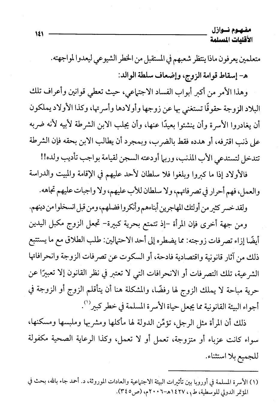 (¬1) الأسرة المسلمة في أوروبا بين تأثيرات البيئة الاجتماعية والعادات الموروثة، د. أحمد جاء بالله، بحث في المؤتمر الدولي للوسطية، ط 1، 1427 هـ - 2006 م، (ص 345).