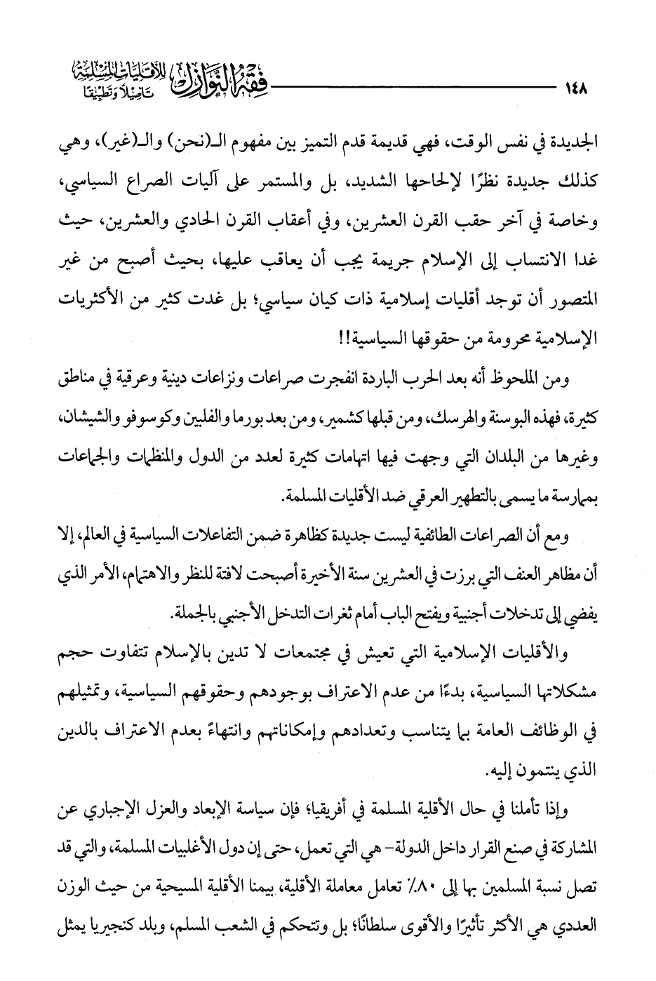الجديدة في نفس الوقت، فهي قديمة قدم التميز بين مفهوم الـ (نحن) والـ (غير)، وهي كذلك جديدة نظرًا لإلحاحها الشديد، بل والمستمر على آليات الصراع السياسي، وخاصة في آخر حقب القرن العشرين، وفي أعقاب القرن الحادي والعشرين، حيث غدا الانتساب إلى الإسلام جريمة يجب أن يعاقب عليها، بحيث أصبح من غير المتصور أن توجد أقليات إسلامية ذات كيان سياسي؛ بل غدت كثير من الأكثريات الإسلامية محرومة من حقوقها السياسية!!