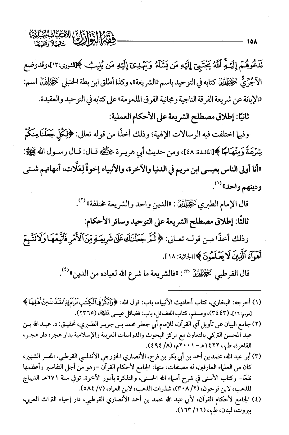 تَدْعُوهُمْ إِلَيْهِ اللَّهُ يَجْتَبِي إِلَيْهِ مَنْ يَشَاءُ وَيَهْدِي إِلَيْهِ مَنْ يُنِيبُ} [الشورى: 13]، وقد وضع الآجُرِّيُّ -رحمه الله- كتابه في التوحيد باسم "الشريعة"، وكذا أطلق ابن بطة الحنبلي -رحمه الله- اسم: "الإبانة عن شريعة الفرقة الناجية ومجانبة الفرق المذمومة" على كتابه في التوحيد والعقيدة.