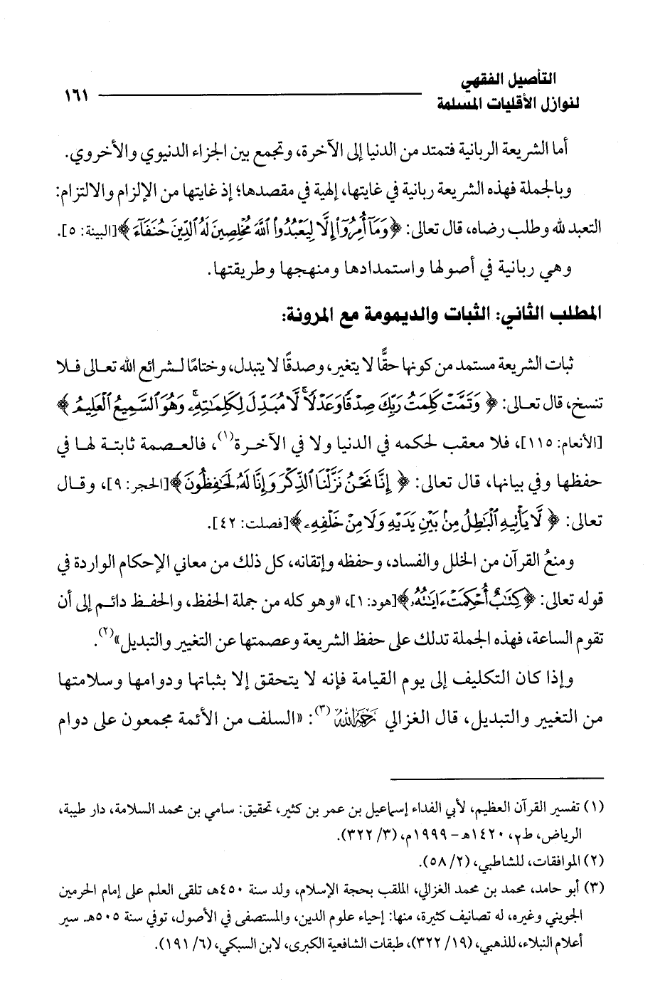 وإذا كان التكليف إلى يوم القيامة فإنه لا يتحقق إلا بثباتها ودوامها وسلامتها من التغيير والتبديل، قال الغزالي -رحمه الله- (¬3): "السلف من الأئمة مجمعون على دوام