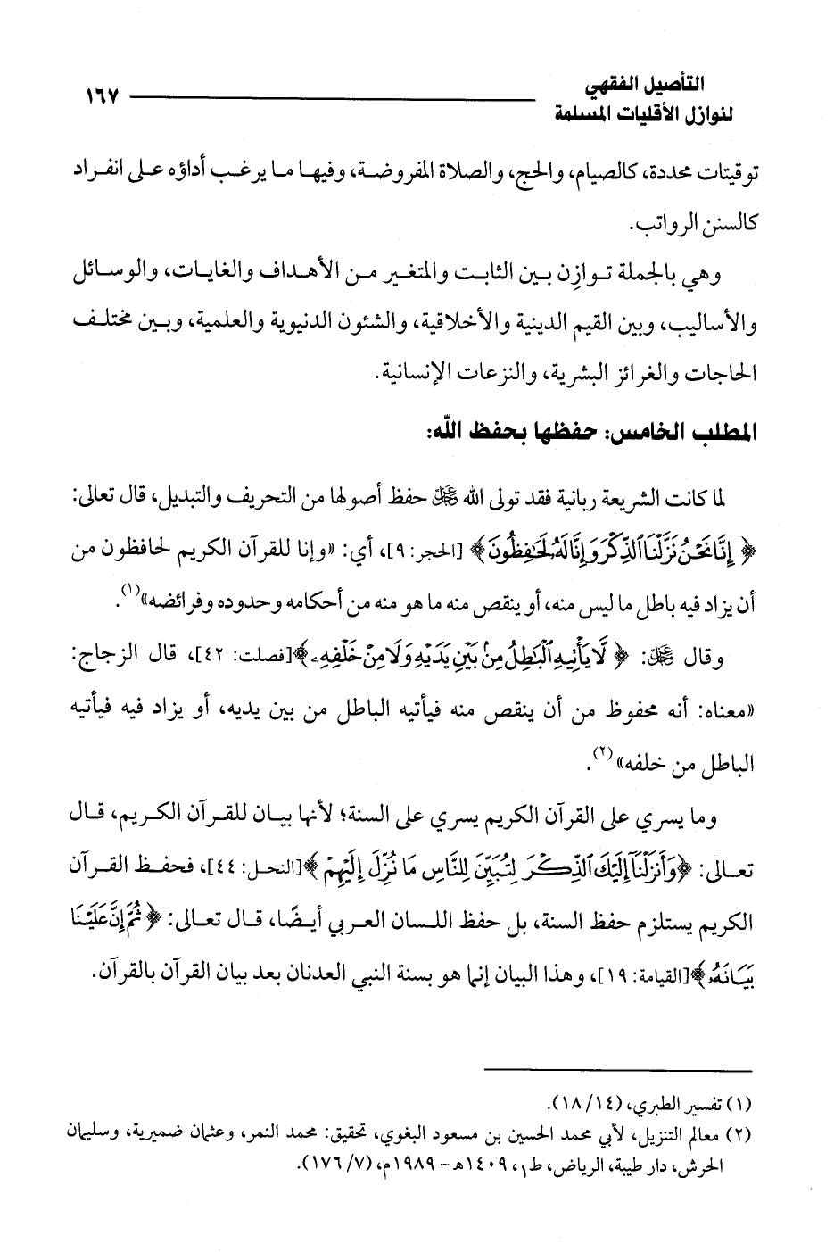 لما كانت الشريعة ربانية فقد تولى الله -عز وجل- حفظ أصولها من التحريف والتبديل، قال تعالى: {إِنَّا نَحْنُ نَزَّلْنَا الذِّكْرَ وَإِنَّا لَهُ لَحَافِظُونَ} [الحجر: 9]، أي: "وإنا للقرآن الكريم لحافظون من أن يزاد فيه باطل ما ليس منه، أو ينقص منه ما هو منه من أحكامه وحدوده وفرائضه" (¬1).