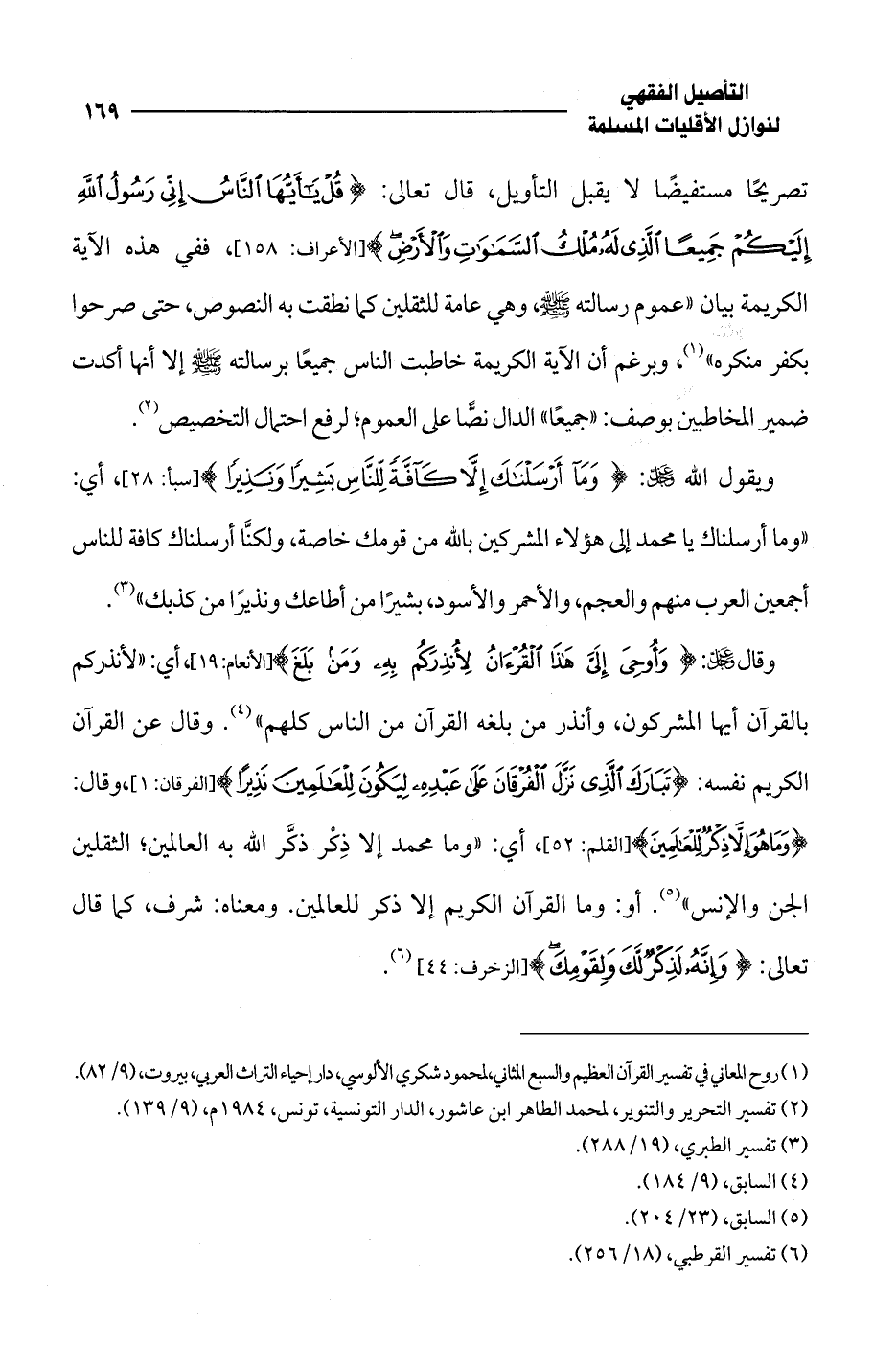 تصريحًا مستفيضًا لا يقبل التأويل، قال تعالى: {يَاأَيُّهَا النَّاسُ إِنِّي رَسُولُ اللَّهِ إِلَيْكُمْ جَمِيعًا الَّذِي لَهُ مُلْكُ السَّمَاوَاتِ وَالْأَرْضِ} [الأعراف: 158]، ففي هذه الآية الكريمة بيان "عموم رسالته - صلى الله عليه وسلم -، وهي عامة للثقلين كما نطقت به النصوص، حتى صرحوا بكفر منكره" (¬1)، وبرغم أن الآية الكريمة خاطبت الناس جميعًا برسالته - صلى الله عليه وسلم - إلا أنها أكدت ضمير المخاطبين بوصف: "جميعًا" الدال نصًّا على العموم؛ لرفع احتمال التخصيص (¬2).