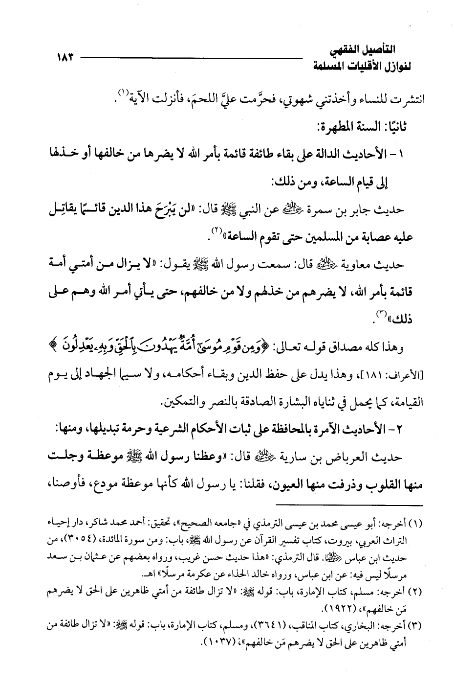 وهذا كله مصداق قوله تعالى: {وَمِنْ قَوْمِ مُوسَى أُمَّةٌ يَهْدُونَ بِالْحَقِّ وَبِهِ يَعْدِلُونَ} [الأعراف: 181]، وهذا يدل على حفظ الدين وبقاء أحكامه، ولا سيما الجهاد إلى يوم القيامة، كما يحمل في ثناياه البشارة الصادقة بالنصر والتمكين.