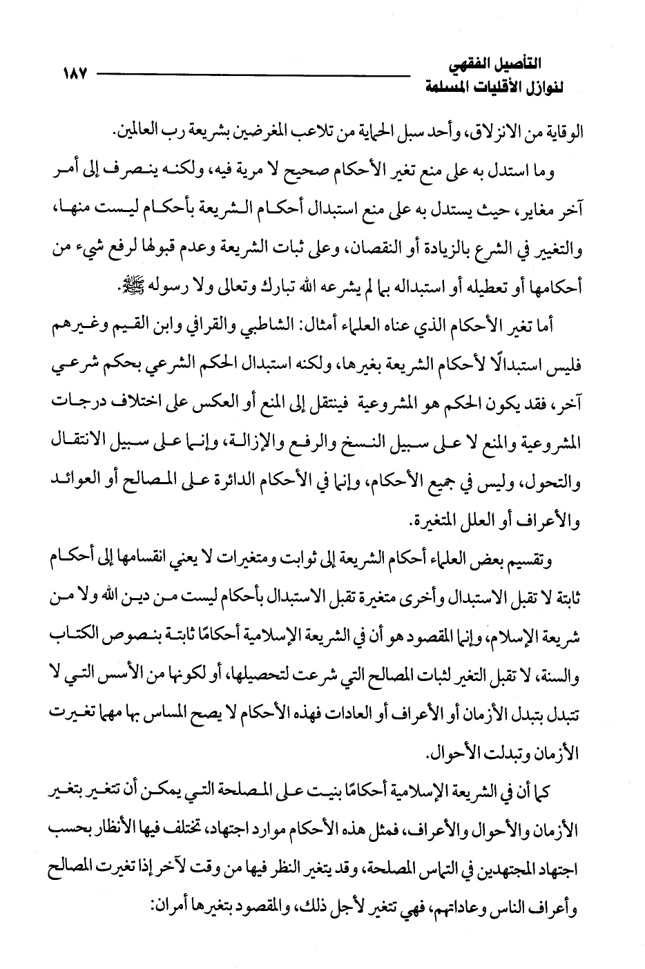 أما تغير الأحكام الذي عناه العلماء أمثال: الشاطبي والقرافي وابن القيم وغيرهم فليس استبدالًا لأحكام الشريعة بغيرها، ولكنه استبدال الحكم الشرعي بحكم شرعي آخر، فقد يكون الحكم هو المشروعية فينتقل إلى المنع أو العكس على اختلاف درجات المشروعية والمنع لا على سبيل النسخ والرفع والإزالة، وإنما على سبيل الانتقال والتحول، وليس في جميع الأحكام، وإنما في الأحكام الدائرة على المصالح أو العوائد والأعراف أو العلل المتغيرة.