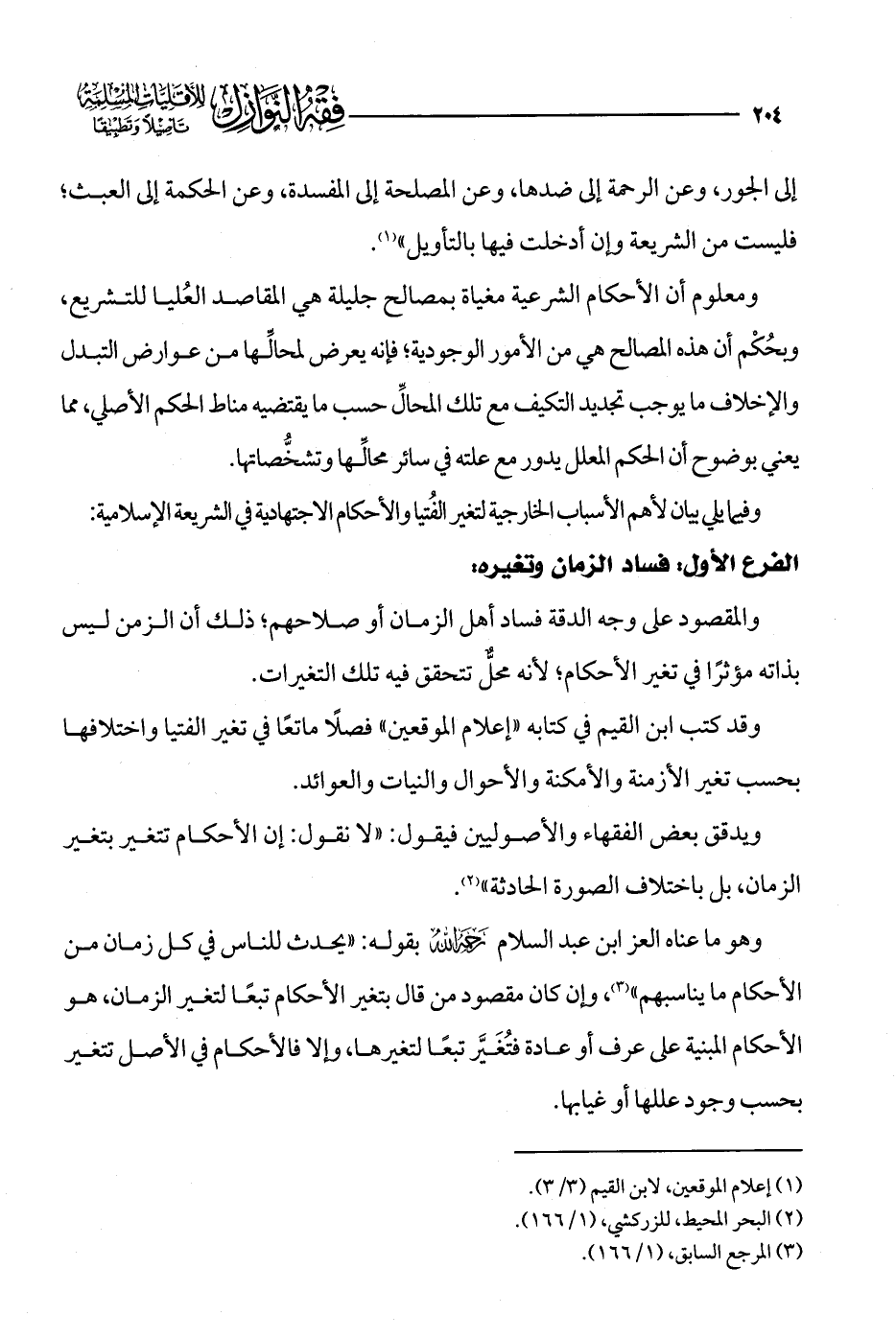 وهو ما عناه العز ابن عبد السلام -رحمه الله- بقوله: "يحدث للناس في كل زمان من الأحكام ما يناسبهم" (¬3)، وإن كان مقصود من قال بتغير الأحكام تبعًا لتغير الزمان، هو الأحكام المبنية على عرف أو عادة فتُغَيَّر تبعًا لتغيرها، وإلا فالأحكام في الأصل تتغير بحسب وجود عللها أو غيابها.