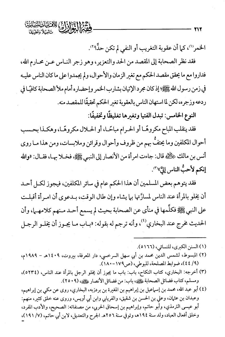 فقد ينقلب المباح مكروهًا أو الحرام مباحًا، أو الحلال مكروهًا، وهكذا بحسب أحوال المكلفين وما يحتفُّ بهم من ظروف وأحوال وقرائن وملابسات، ومن هذا ما روى أنس بن مالك -رضي الله عنه- قال: جاءت امرأة من الأنصار إلى النبي - صلى الله عليه وسلم -، فخلا بها، فقال: "والله إنكم لأحبُّ الناس إليَّ" (¬3).