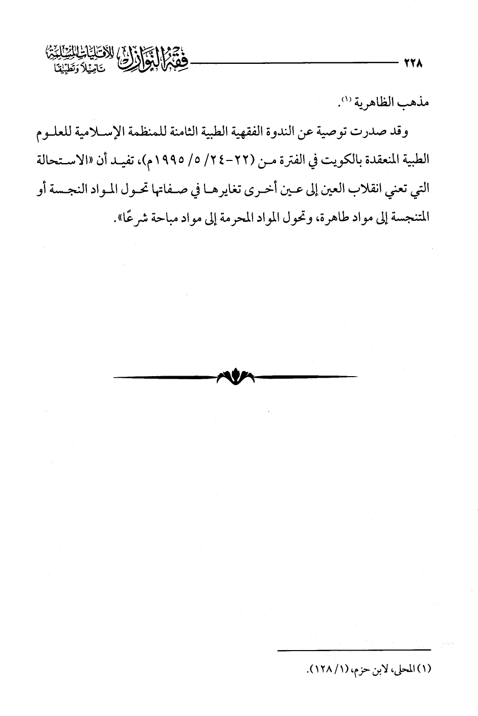 وقد صدرت توصية عن الندوة الفقهية الطبية الثامنة للمنظمة الإسلامية للعلوم الطبية المنعقدة بالكويت في الفترة من (22 - 24/ 5/ 1995 م)، تفيد أن "الاستحالة التي تعني انقلاب العين إلى عين أخرى تغايرها في صفاتها تحول المواد النجسة أو المتنجسة إلى مواد طاهرة، وتحول المواد المحرمة إلى مواد مباحة شرعًا".