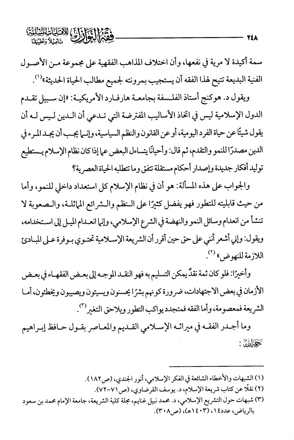 ويقول د. هوكنج أستاذ الفلسفة بجامعة هارفارد الأمريكية: "إن سبيل تقدم الدول الإسلامية ليس في اتخاذ الأساليب المفترضة التي تدعي أن الدين ليس له أن يقول شيئًا عن حياة الفرد اليومية، أو عن القانون والنظم السياسية، وإنما يجب أن يجد المرء في الدين مصدرًا للنمو والتقدم، ثم قال: وأحيانًا يتساءل البعض عما إذا كان نظام الإسلام يستطيع توليد أفكار جديدة وإصدار أحكام مستقلة تتفق وما تتطلبه الحياة العصرية؟