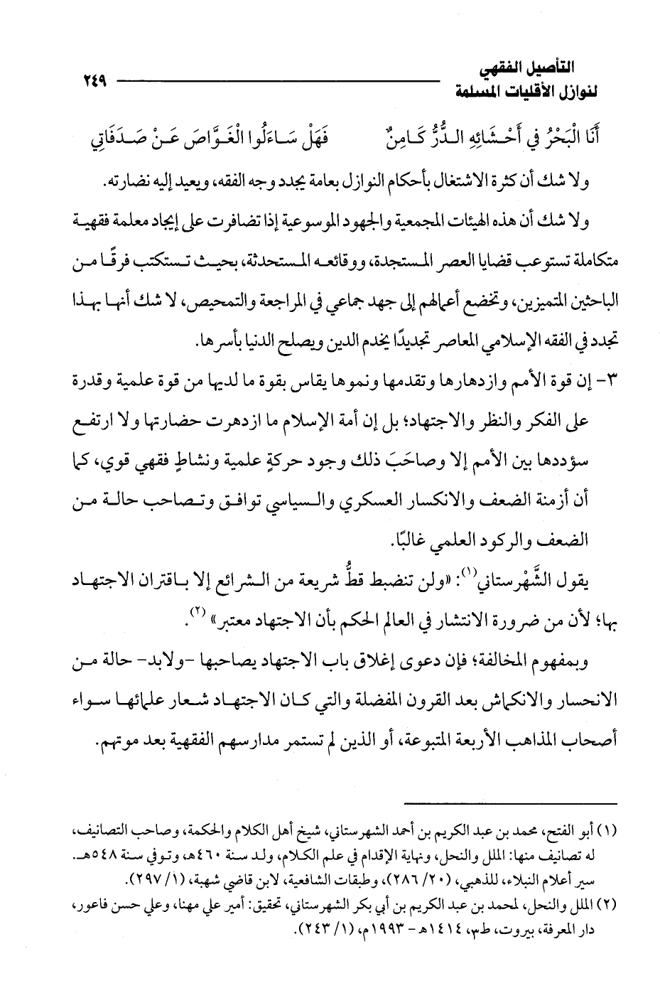 يقول الشَّهْرستاني (¬1): "ولن تنضبط قطُّ شريعة من الشرائع إلا باقتران الاجتهاد بها؛ لأن من ضرورة الانتشار في العالم الحكم بأن الاجتهاد معتبر" (¬2).