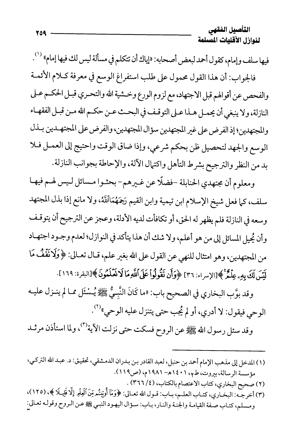 ومعلوم أن مجتهدي الحنابلة -فضلًا عن غيرهم- بحثوا مسائل ليس لهم فيها سلف، كما فعل شيخ الإسلام ابن تيمية وابن القيم رَحِمَهُمَا اللهُ، ولا مانع إذا بذل المجتهد وسعه في النازلة فلم يظهر له الحق، أو تكافأت لديه الأدلة، وعجز عن الترجيح أن يتوقف وأن يُحيل المسائل إلى من هو أعلم، ولا شك أن هذا يتأكد في النوازل؛ لعدم وجود اجتهاد من المجتهدين، وهو امتثال للنهي عن القول على الله بغير علم، قال تعالى: {وَلَا تَقْفُ مَا لَيْسَ لَكَ بِهِ عِلْمٌ} [الإسراء: 36] {وَأَنْ تَقُولُوا عَلَى اللَّهِ مَا لَا تَعْلَمُونَ} [البقرة: 169].
