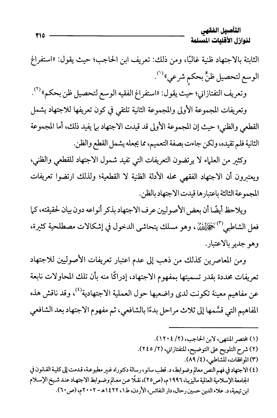 (¬4) الاجتهاد في فهم النص معالم وضوابط، د. قطب سانو، رسالة دكتوراه غير مطبوعة، قدمت إلى كلية القانون في الجامعة الإسلامية العالمية ماليزيا، 1996 م، (ص 25)، نقلًا عن معالم وضوابط الاجتهاد عند شيخ الإسلام ابن تيمية، د. علاء الدين حسين رحال، دار النفائس، الأردن، ط 1، 1422 هـ - 2002 م، (ص 60).