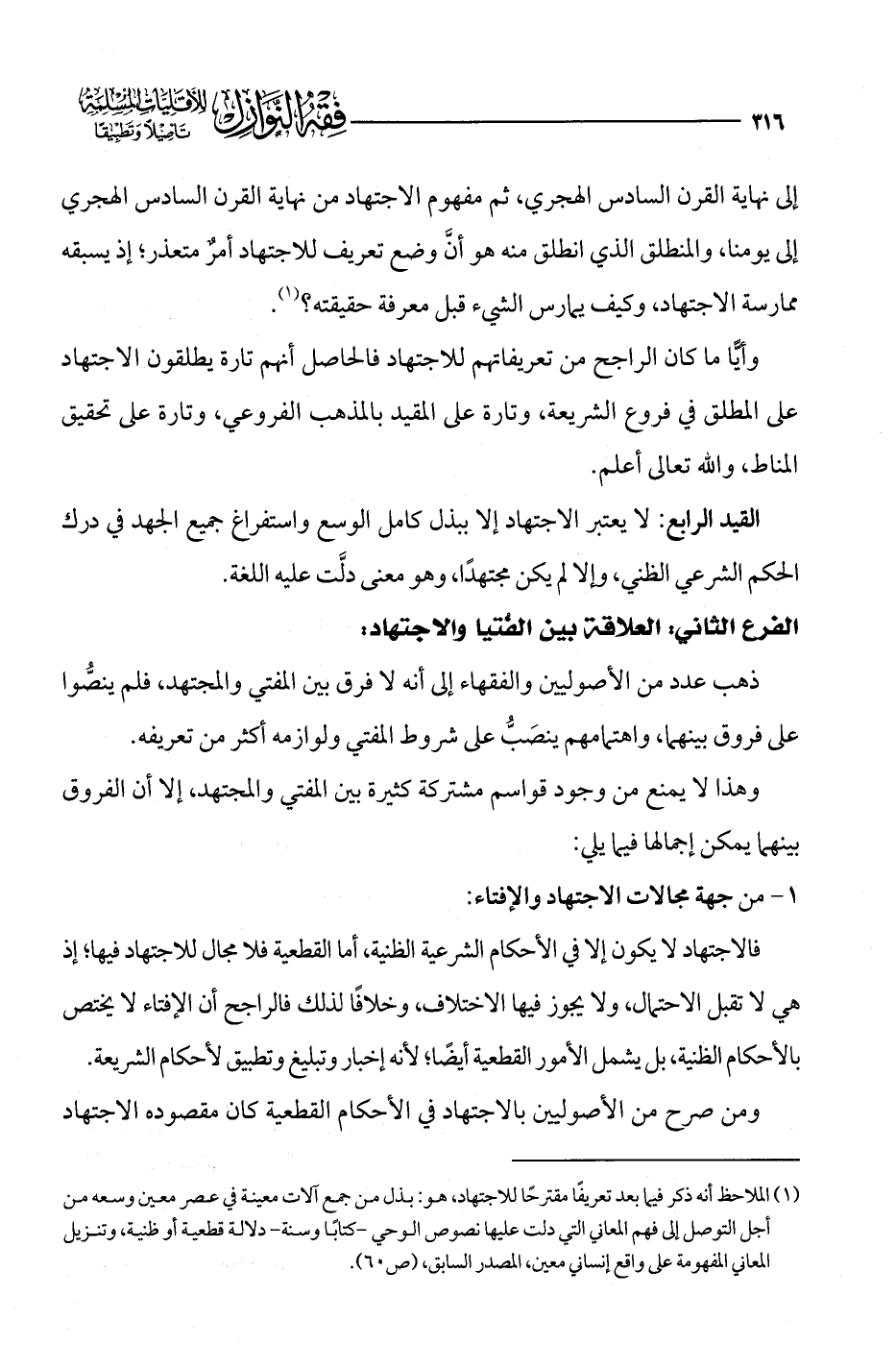 (¬1) الملاحظ أنه ذكر فيما بعد تعريفًا مقترحًا للاجتهاد، هو: بذل من جمع آلات معينة في عصر معين وسعه من أجل التوصل إلى فهم المعاني التي دلت عليها نصوص الوحي -كنابًا وسنة- دلالة قطعية أو ظنية، وتنزيل المعاني المفهومة على واقع إنساني معين، المصدر السابق، (ص 60).