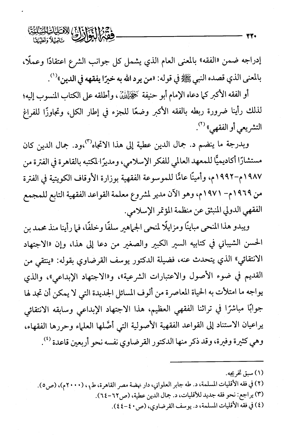 وبدرجة ما ينضم د. جمال الدين عطية إلى هذا الاتجاه (¬3)، ود. جمال الدين كان مستشارًا أكاديميًّا للمعهد العالمي للفكر الإسلامي، ومديرًا لمكتبه بالقاهرة في الفترة من 1987 م - 1992 م، وأمينًا عامًّا للموسوعة الفقهية بوزارة الأوقاف الكويتية في الفترة من 1969 م - 1971 م، وهو الآن مدير لمشروع معلمة القواعد الفقهية التابع للمجمع الفقهي الدولي المنبثق عن منظمة المؤتمر الإسلامي.