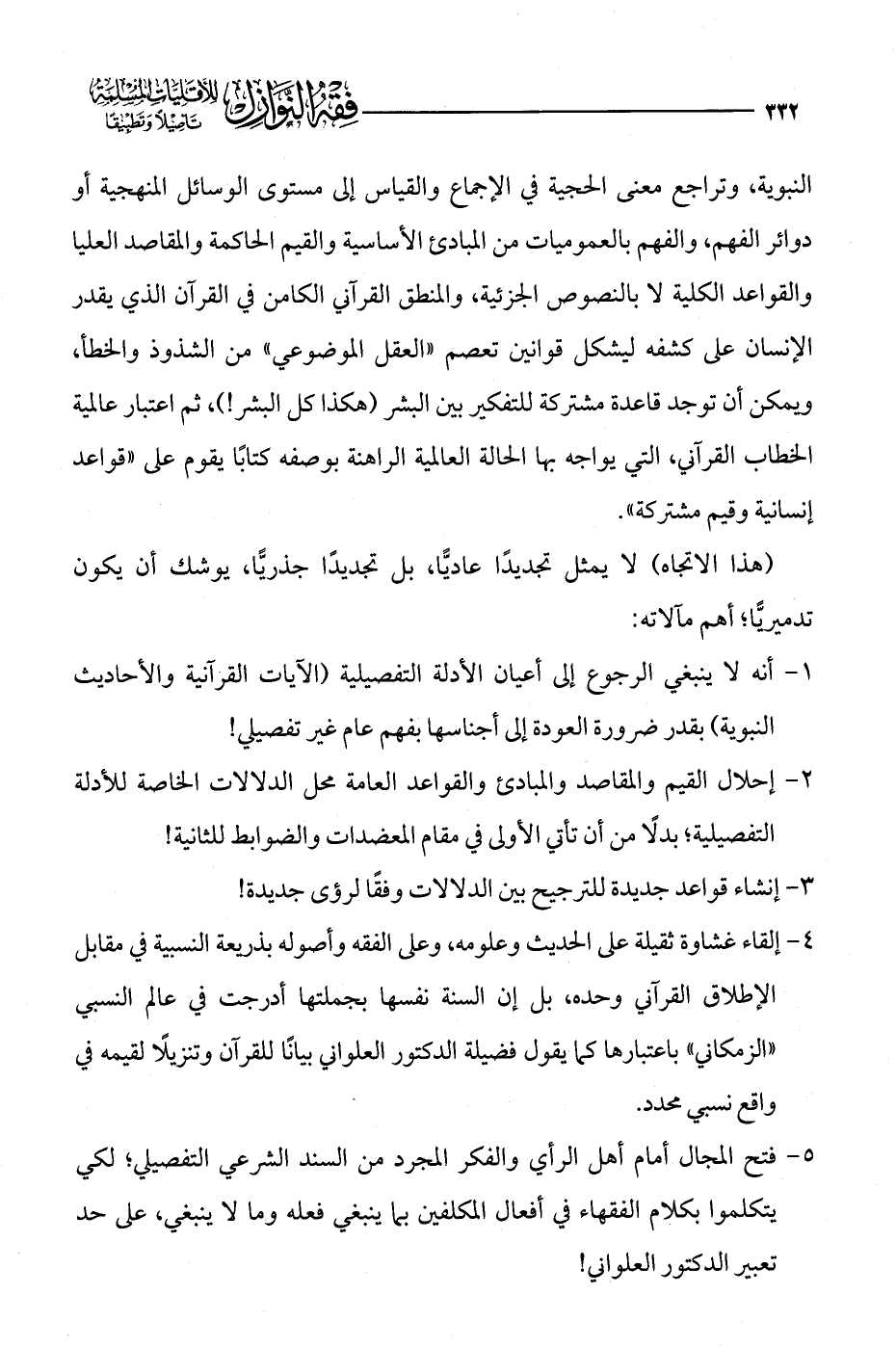 4 - إلقاء غشاوة ثقيلة على الحديث وعلومه، وعلى الفقه وأصوله بذريعة النسبية في مقابل الإطلاق القرآني وحده، بل إن السنة نفسها بجملتها أدرجت في عالم النسبي "الزمكاني" باعتبارها كما يقول فضيلة الدكتور العلواني بيانًا للقرآن وتنزيلاً لقيمه في واقع نسبي محدد.